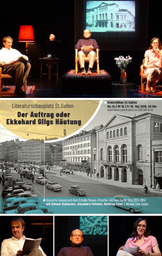 St.Gallen 1957: Eine Atomvergiftung, Politklüngelei, ein Kompositionsauftrag des Stadttheaters und die Liebe zwingen den eigenbrötlerischen Klavierlehrer Gilg zur Metamorphose. Szenische Lesung nach dem St.Galler Roman „Parsifal“ von Hans Rudolf Hilty (1925-1994) mit Simone Stahlecker, Alexandre Pelichet und Matthias Peter.