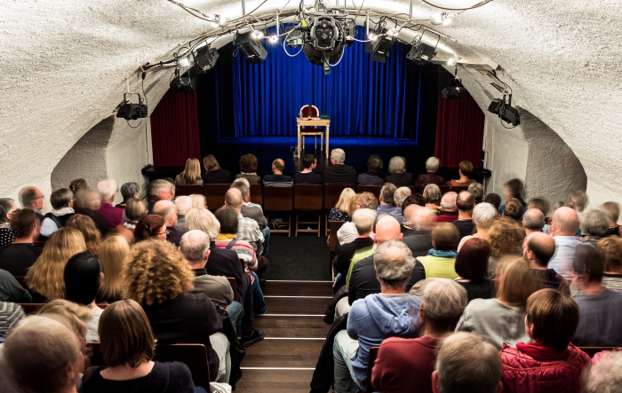 Matthias Peter führt anekdotenreich durch die Räume der Kellerbühne unter Mitwirkung von Technik-, Kassa- und Bar-Personal